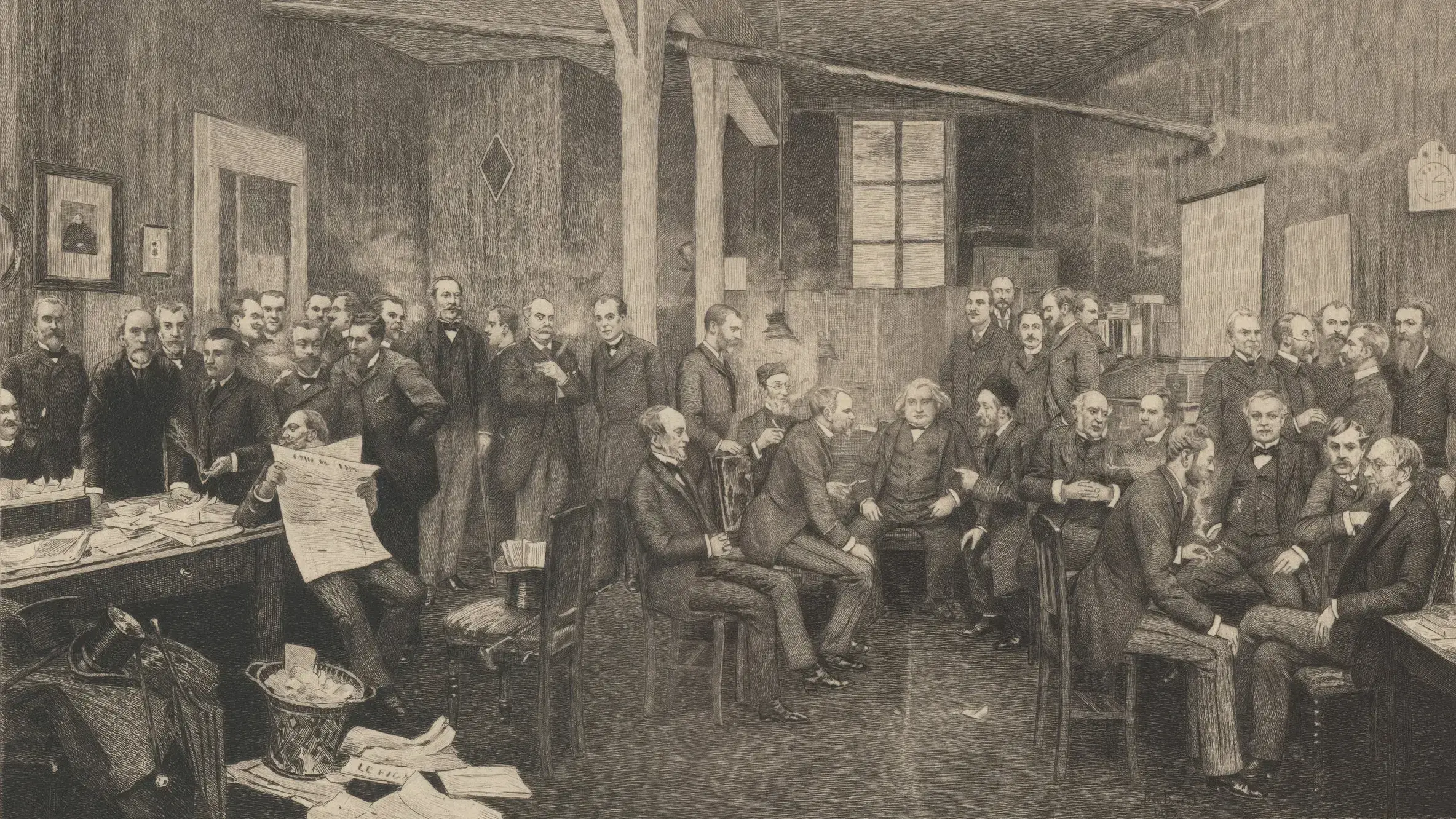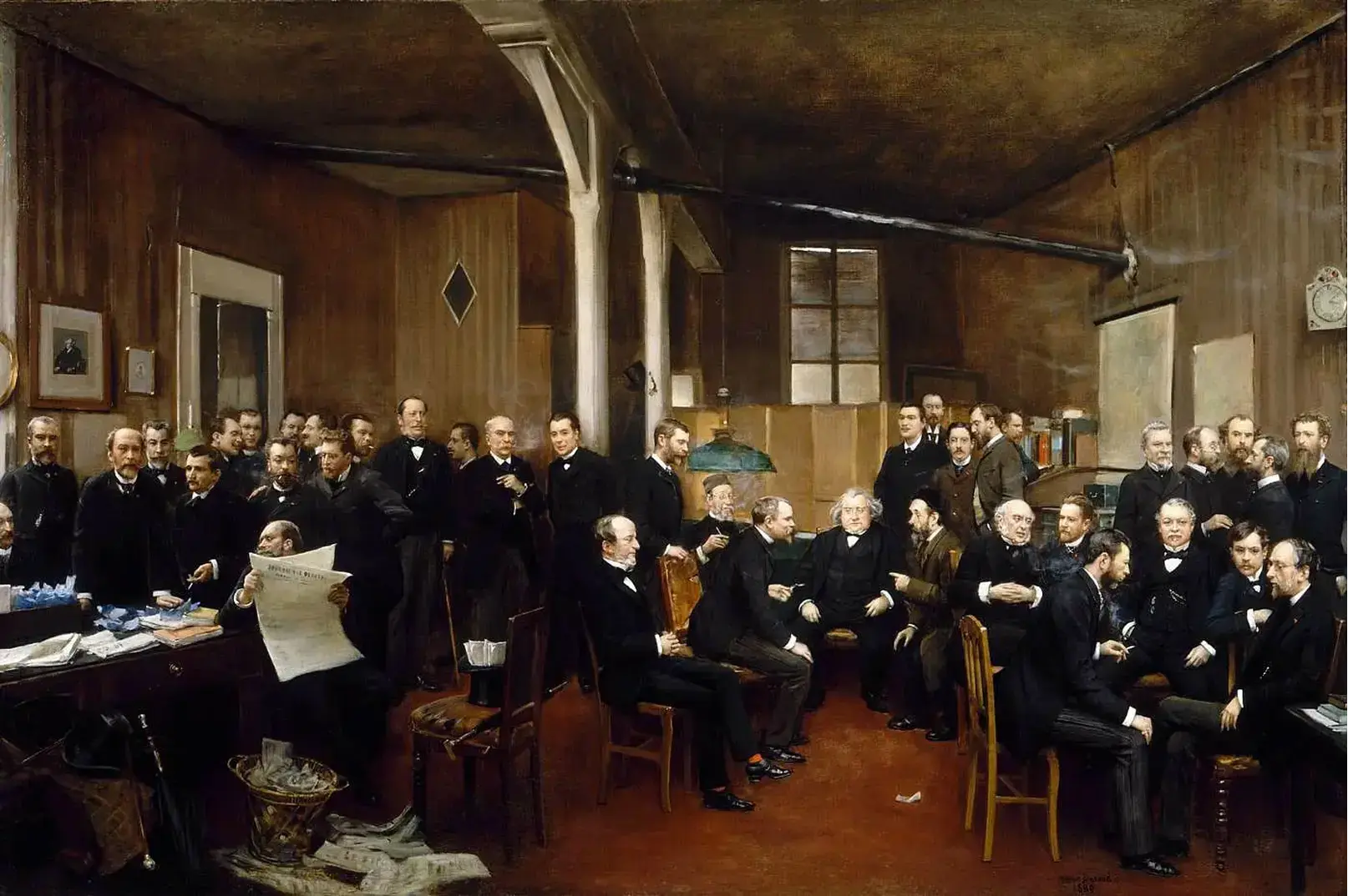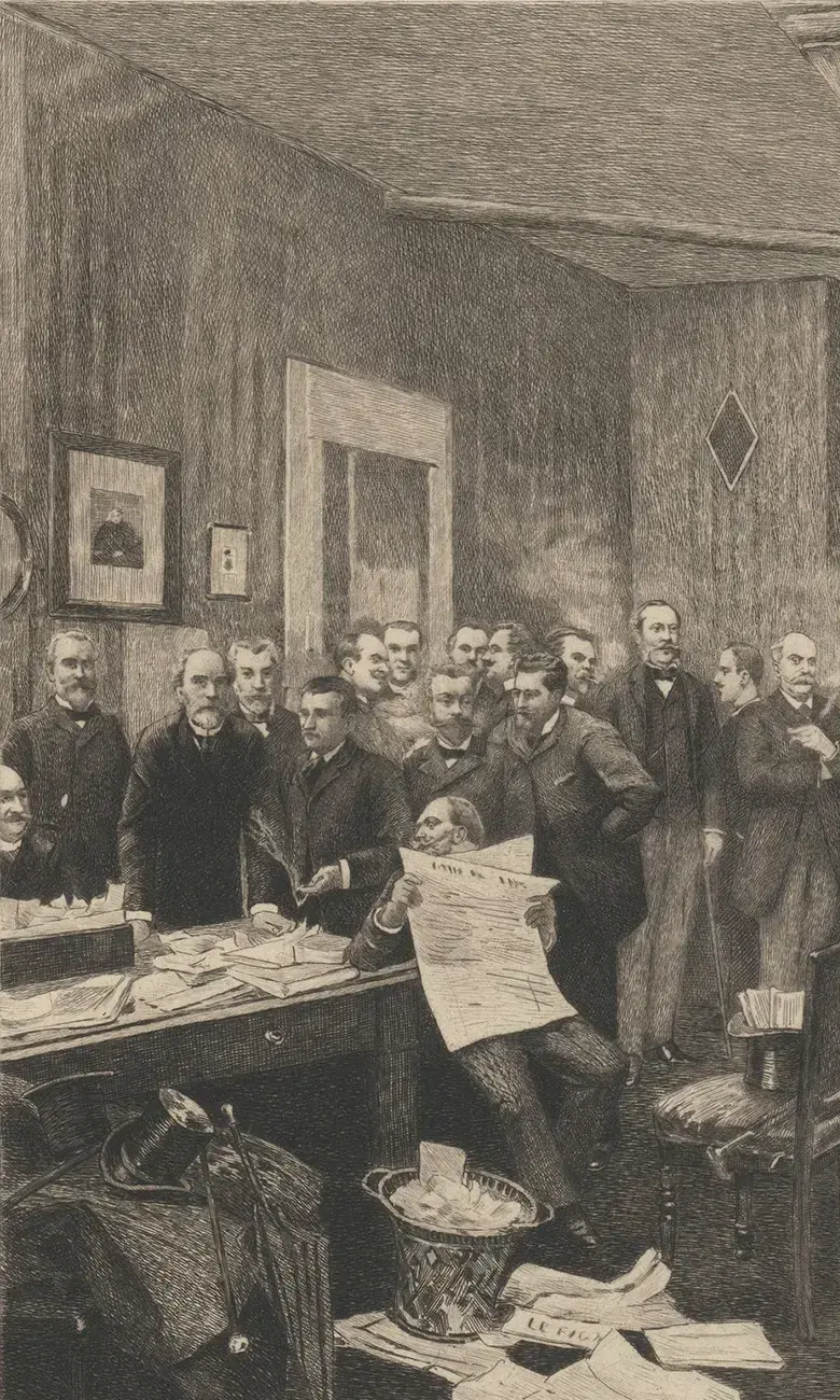 The Journal des débats was founded during the Revolution of 1789. By 1830, it was one of the most widely circulated newspapers before ceasing publication in 1944. The scene in the painting takes place on the ground floor of the hotel.