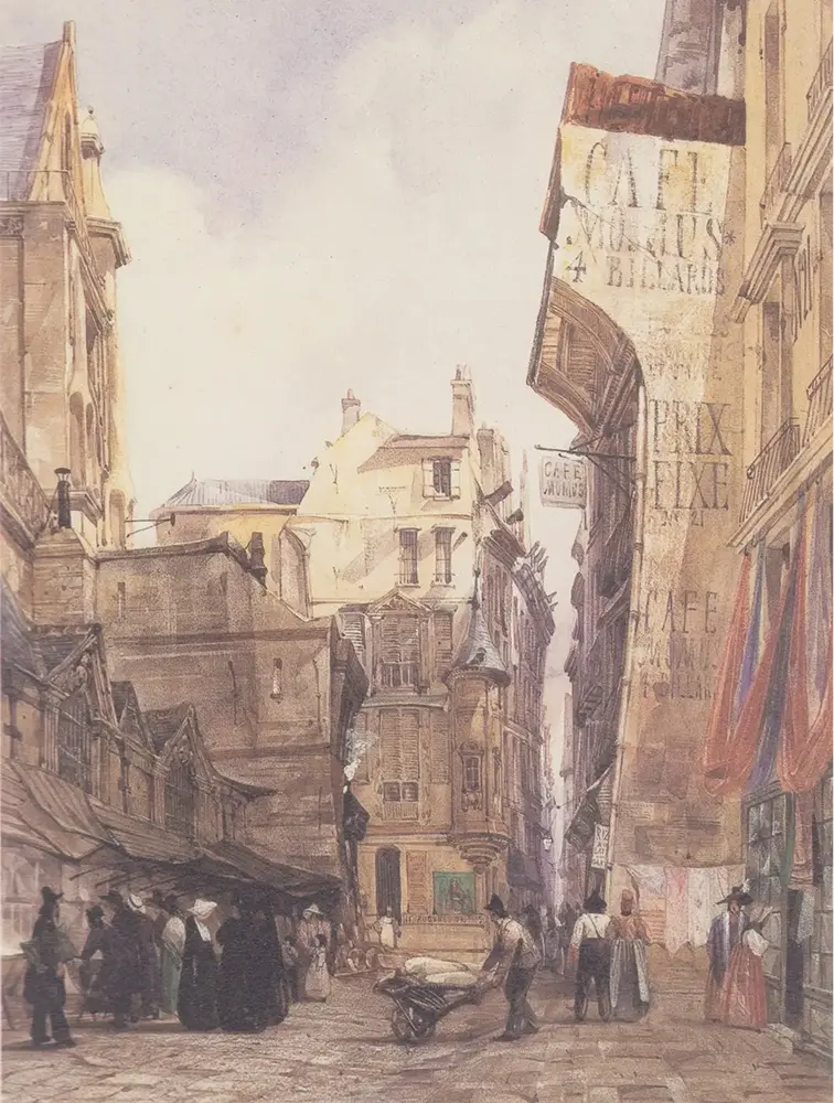 The ground floor and first floor of the current Relais du Louvre were occupied by the famous Café Momus until 1856, as shown in Shotter Boys’ watercolor painting, which also shows that the house still had its gable, characteristic of buildings dating from before the Renaissance.